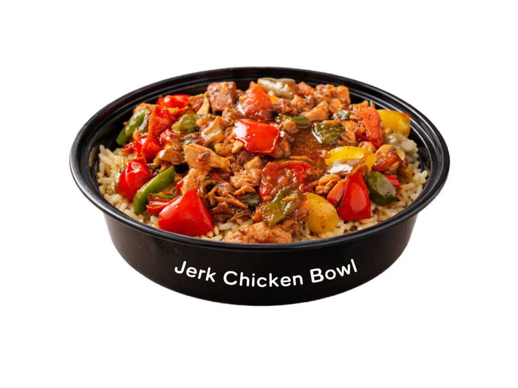 Jerk sauce, seasoned bell peppers, Grilled jerk, onions and grilled jerk chicken served over coconut rice